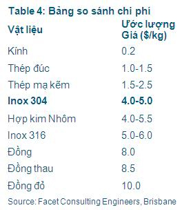 Dưới đây là bảng so sánh về chi phí khi sử dụng inox 304 so với các loại vật liệu khác: